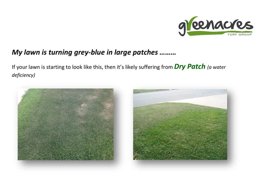My lawn is turning grey-blue in large patches… If your lawn is starting to look like this, then it’s likely suffering from Dry Patch (a water deficiency).